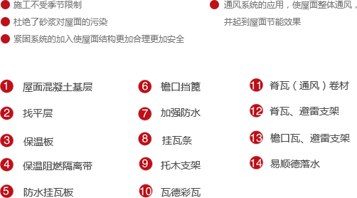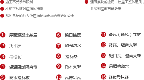 借鑒歐洲坡屋面防水理念,將平面防水改為立體防水,采用新型防水板材料,將材料防水和構(gòu)造防水于一身,配合屋面系統(tǒng)組件,實現(xiàn)全天候全干作業(yè)。節(jié)省了屋面各類保護層次,打破了屋面冬季及雨后陰濕無法施工的常規(guī),縮短了工期,提升系統(tǒng)安全性能。